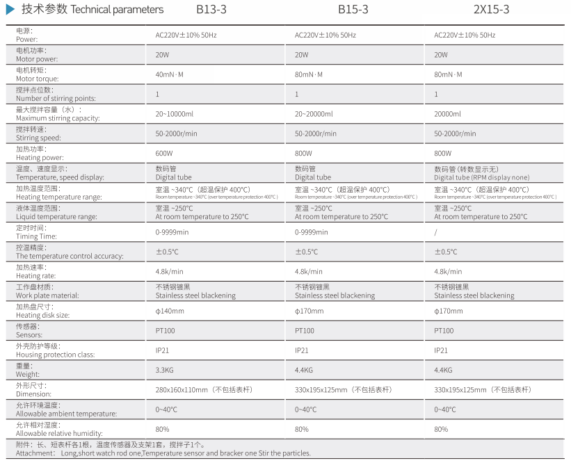 B13-3、B15-3智能型恒溫磁力攪拌器,改變了用電位器調(diào)速的老傳統(tǒng),現(xiàn)采用 旋轉(zhuǎn)的編碼器,轉(zhuǎn)速穩(wěn)定、精確、使用更方便,每轉(zhuǎn)動一級就增加或減少 10r/min。溫度控制采用 PID 控制,解決了以前溫度過沖大的現(xiàn)象;可對容器的材料、容器內(nèi)液體的容量已經(jīng)所需達到的溫度加以分析,控制儀器加熱盤加熱時間長短。達到恒溫的目的,控溫更精確。