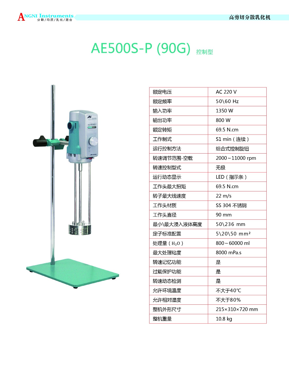 AE500S-P(90G)高剪切分散乳化機(jī)采用結(jié)構(gòu)緊湊的串激式微型高速電機(jī)驅(qū)動,適用于實(shí)驗(yàn)室或中試車間的低至中、高粘度液體的攪拌混合、粉碎顆粒物料在液體介質(zhì)中剪切乳化。