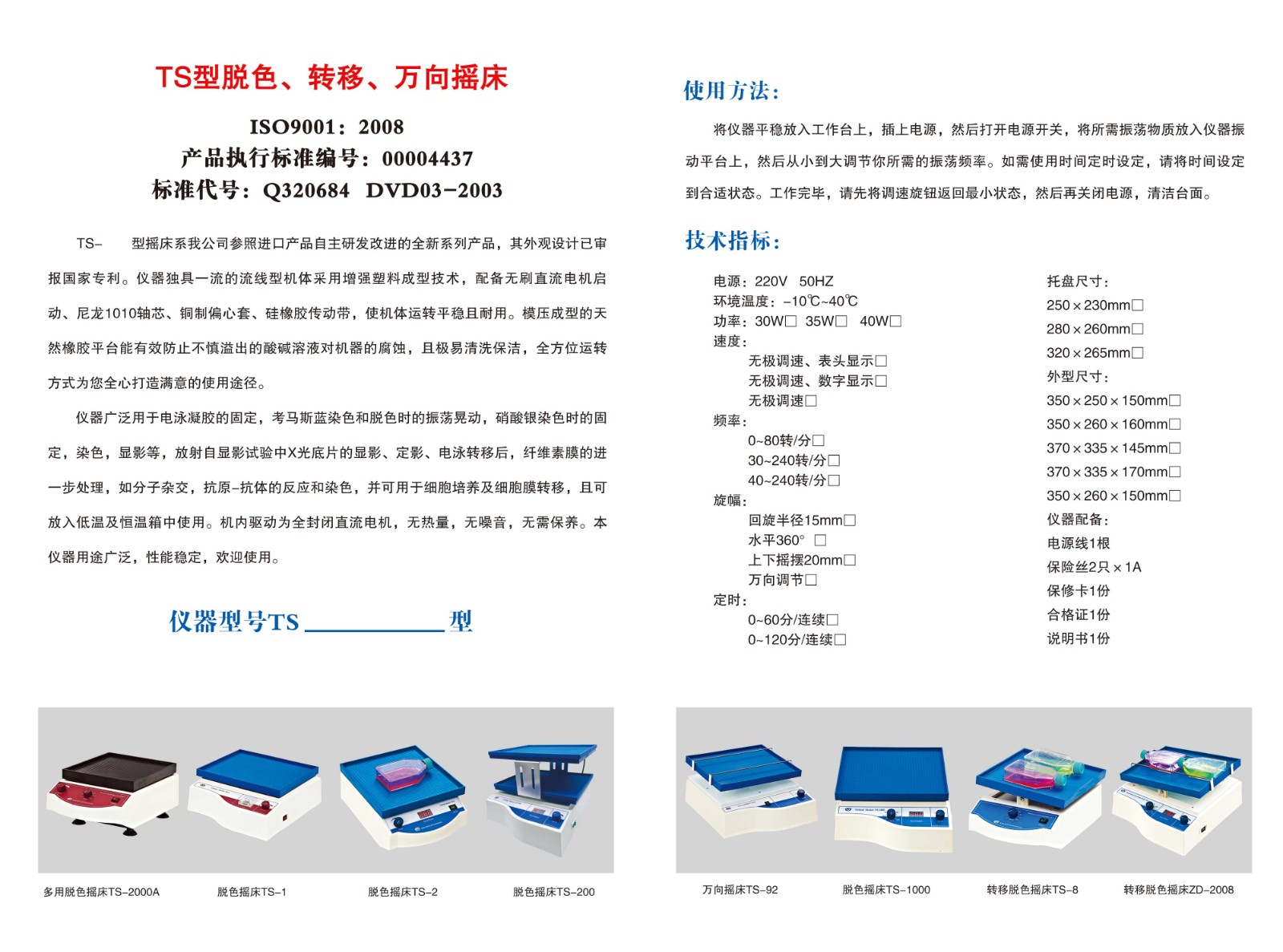TS型脫色、轉移、萬向搖床系列廣泛用于電泳凝膠的固定,考馬斯藍染色和脫色時的振蕩搖晃,