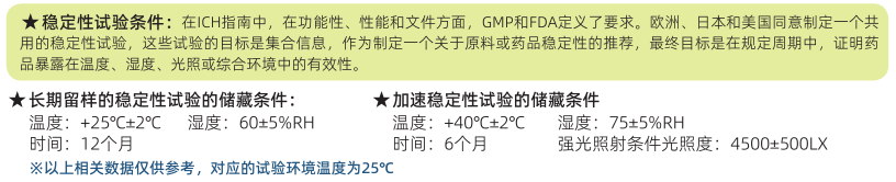 ● 對于包裝在半透性容器中的藥物制劑的長期試驗,則應在溫度25℃土2℃/40%±5%RH或30℃士2℃/35%士5%RH的條件進行試驗