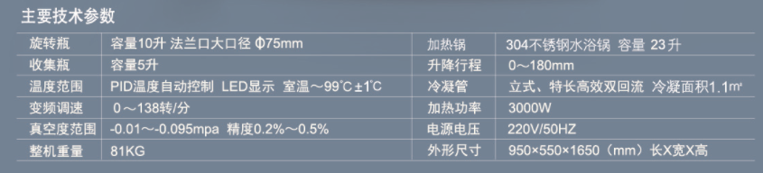 | 關(guān)鍵字 | 旋轉(zhuǎn)瓶:10升 收集瓶:5升 溫度范圍:PID溫度自動(dòng)控制LED顯示 室溫-99℃±1℃ 變頻調(diào)速:0-138轉(zhuǎn)/分 真空范圍:內(nèi)置式設(shè)定-0.01~0.095Mpa 精度0.2%~0.5% 升降范圍:0-180mm 冷凝器:立式,特長(zhǎng)高效雙回流 加熱功率:3KW |