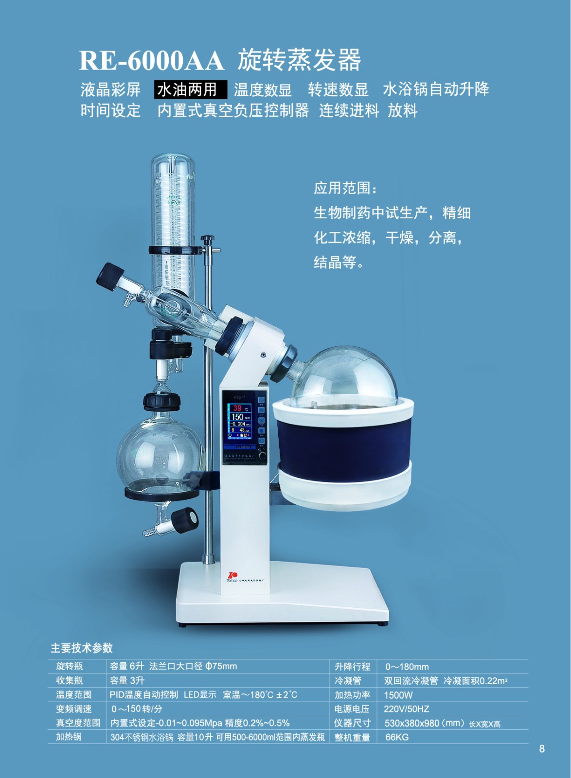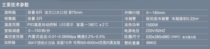 | 關(guān)鍵字 | 室溫-180℃±2℃;變頻調(diào)速:0-150轉(zhuǎn)/分 旋轉(zhuǎn)瓶:容量 6升 法蘭口大口徑 75mm 收集瓶:容量 3升 真空范圍:內(nèi)置式設(shè)定-0.01~0.095Mpa 精度0.2%~0.5% 升降范圍:0-180mm 加熱功率:1.5KW |