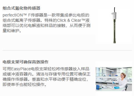 SD50 pH/離子儀配備PerfectIon組合式氟離子電極。該套件包括一個高效的電極支架。