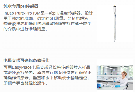 SD50 pH/離子儀,配備InLab Pure-Pro ISM pH/溫度傳感器,用于純水的pH測(cè)量,具有自動(dòng)傳感器識(shí)別功能。該套件包括一個(gè)高效的電極支架和pH緩沖液袋,用于初始校準(zhǔn)。