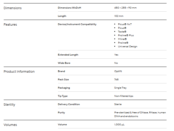 The non-filtered Optifit Tips are designed for best possible fitting and sealing to secure the highest possible accuracy and precision. These pipette tips enable ergonomic and light tip attachment by being compatible with the Optiload feature in Sartorius Picus? Nxt, Picus?, Tacta?, Mline? and Proline? Plus pipettes.