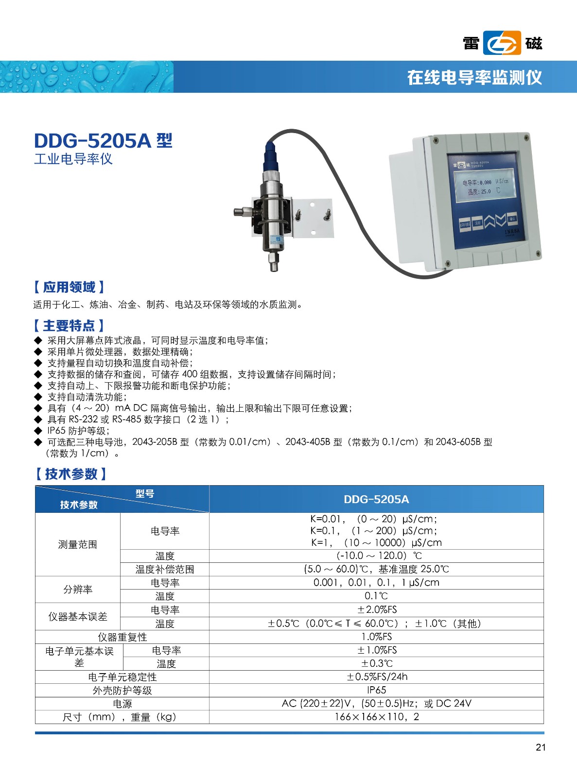 - 關(guān) 鍵 字: 測(cè)量范圍:電導(dǎo)率: (0.000~104)μS/cm;(4~20)mA 電流輸出;RS23通訊;高純水補(bǔ)償