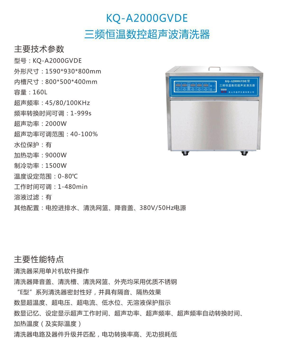 - 關(guān) 鍵 字: 清洗槽內(nèi)尺寸:800*500*400 容量L:160L 超聲功率W:2000 加熱功率W:9000 制冷功率:1500 降音蓋:電控
