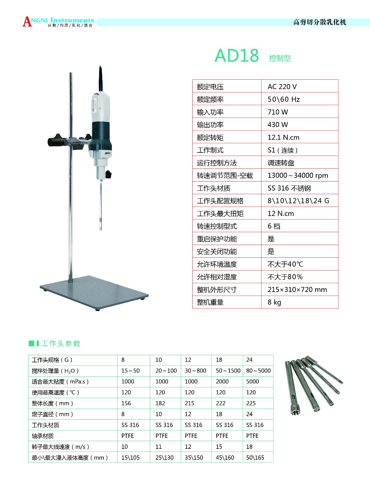 - 關(guān) 鍵 字: 高剪切分散機(jī);乳化機(jī);均質(zhì)機(jī) ;轉(zhuǎn)速范圍:13000-34000rpm;工作頭直徑:24mm;工作頭材質(zhì):316L不銹鋼;處理量:80-5000ml