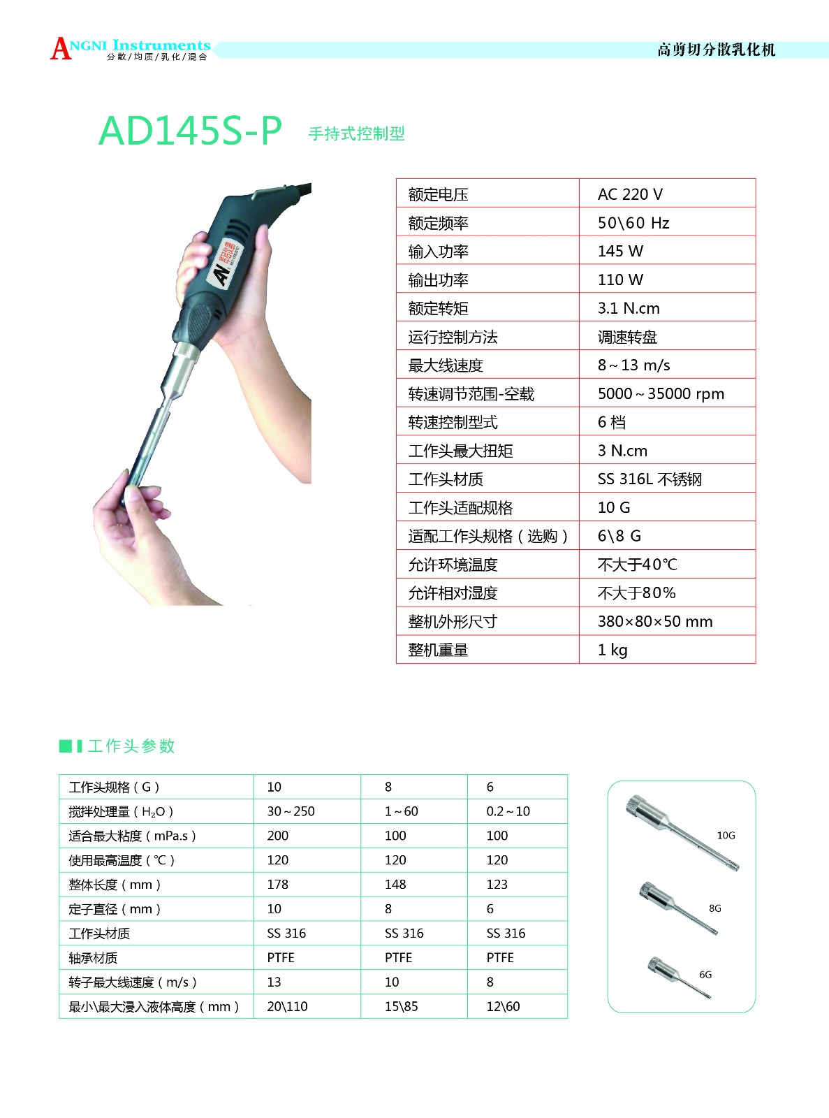 - 關(guān) 鍵 字: 轉(zhuǎn)速調(diào)節(jié)范圍:5000-35000rpm,輸出功率:110W,輸入功率:145W;轉(zhuǎn)速控制形式:6檔,工作頭規(guī)格:10G;直徑:10mm,處理量:30-250ml