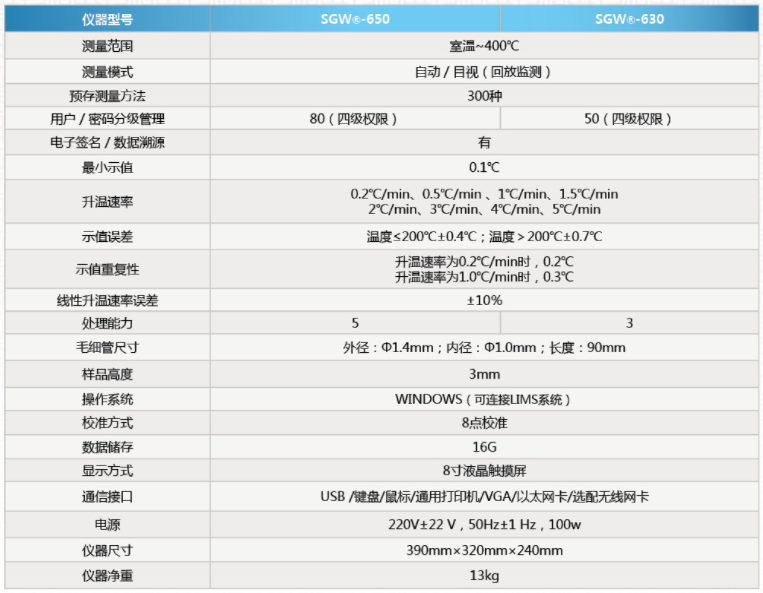 可同時(shí)測定多根毛細(xì)管。SGW@-650可同時(shí)測量5根樣品,SGW@-630可同時(shí)測量3根樣品。