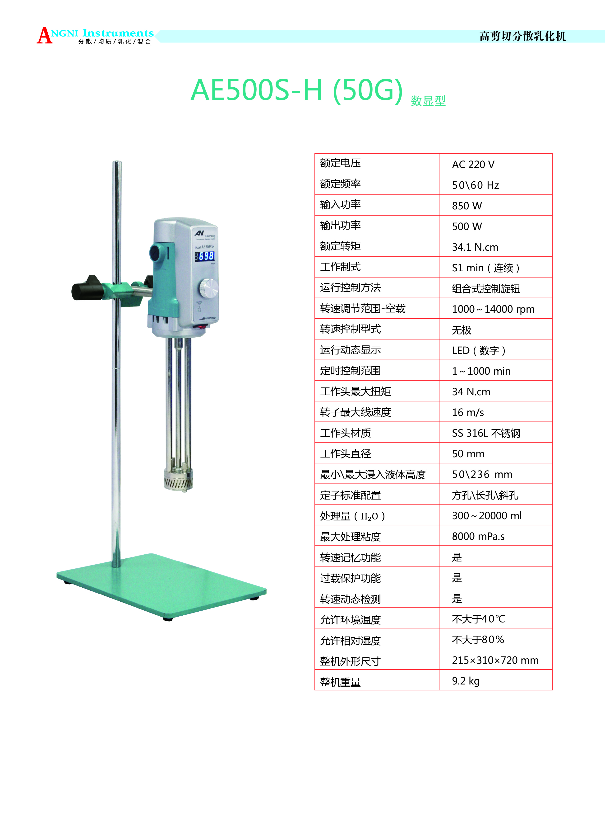 - 商品名稱:上海昂尼高剪切分散乳化機AE500S-H 50G
