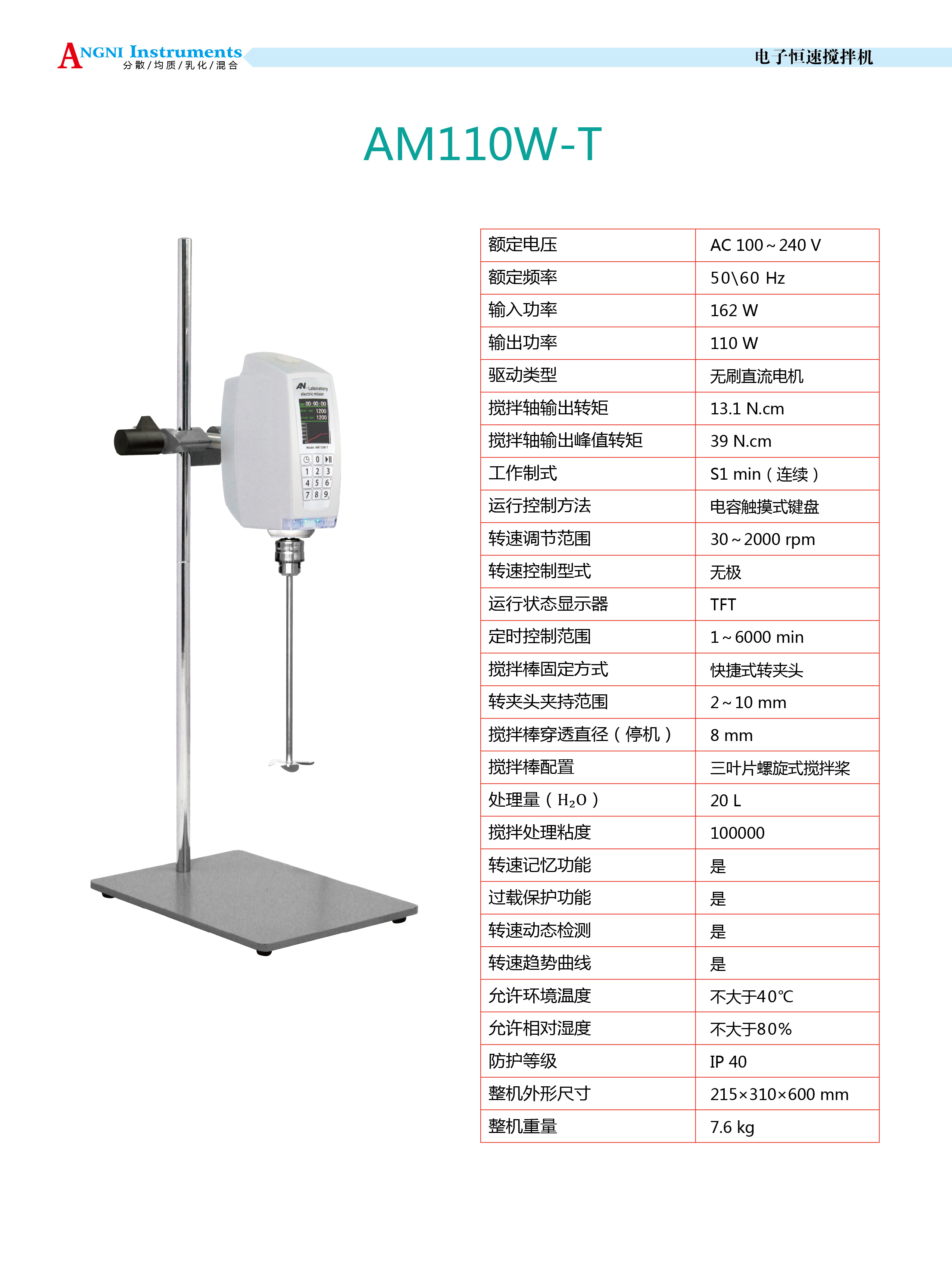 AM110W-T電子恒速攪拌機(jī)采用無(wú)碳刷直流電機(jī)驅(qū)動(dòng),適用于實(shí)驗(yàn)室低至中、高粘度液體的攪拌混合。