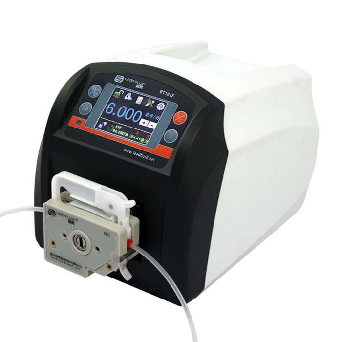 BT101F分配型智能蠕動泵流量范圍0.00011~720毫升/分鐘。采用彩色液晶和觸摸屏技術(shù),操作界面簡單,直觀,明了。主要適用于各種復(fù)雜的液體定量分配,適用于精確計量和定量給料,可以實現(xiàn)高精度的流量傳輸控制。對液量分裝精度要求高時,使用液量分配模式更加方便;對產(chǎn)量要求高時,使用時間分配模式更加方便;需要將一定液體分裝為若干份液體時請使用復(fù)制分配模式。設(shè)置為流量模式時,完全等同于一臺流量型蠕動泵。為了減小不必要的風(fēng)扇噪音,采用了智能溫控技術(shù)。在RS485通訊中,因為采用了MODBUS協(xié)議,更易于與其他控制設(shè)備如計算機,人機界面,PLC等連接。