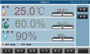 采用大屏幕可程式液晶觸摸屏控制器,可設(shè)置定值/30段程序二種運行模式,每段定時可達9999分鐘,即時顯示設(shè)備運行狀態(tài),各項參數(shù)一屏顯示,操作界面美觀便捷,支持?jǐn)?shù)據(jù)和曲線的記錄保存。