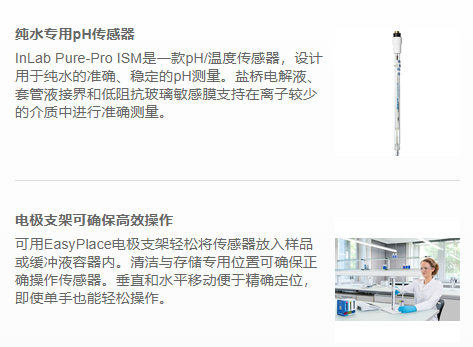 SD20 pH計(jì),配備InLab Pure-Pro ISM pH/溫度傳感器,適用于純水的pH測量,具有自動傳感器識別功能。該套件包括一個高效的電極支架和pH緩沖液袋,用于初始校準(zhǔn)。