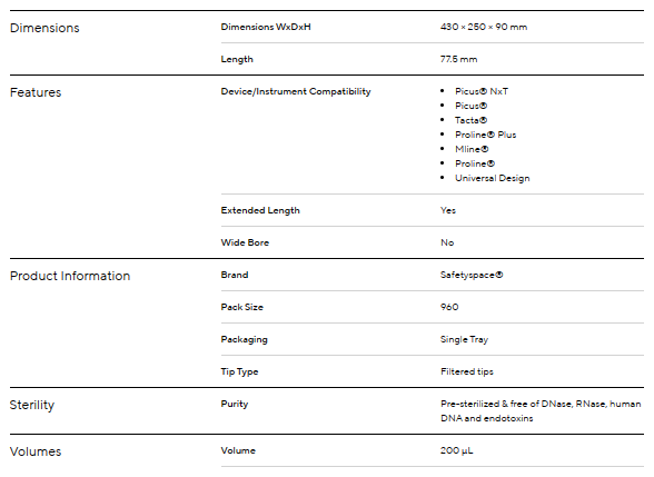 | 關(guān)鍵字 | 延長型濾芯吸頭,200 µl,預(yù)滅菌,盒裝(10x96)新產(chǎn)品,訂購前請查詢匹配表 |