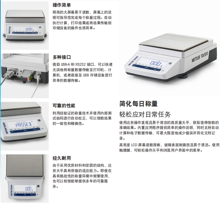 數(shù)據(jù)管理: 2 個接口:USB-A、RS232; 藍牙選件; 重量傳輸功能可輕松傳輸數(shù)據(jù); MT-SICS EasyDirect; 天平軟件